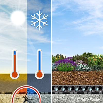 Additionally, ZinCo has designed a range of fantastic hybrid solutions and elaborate system build-ups focusing on stormwater management and counteracting Urban Heat Island effects.